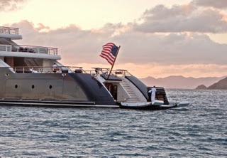 The high freeboard of cargo ships have not been a deterrent for Somali pirates. And, as I opinioned in an earlier blog discussing the high stern on Steve Jobs' 257 ft. Venus, line handling is much more difficult on closed stern boats than on open stern boats. While in Gustavia the day before we watched a nearly 180 ft closed stern ketch, Seahawk, maneuvering to stern tie to the quay wall. The wind was 20 nmph from the SE on the port beam as the ketch backed to port after dropping a bow anchor to windward in the harbor. Both the ketch and the harbormaster had large tenders assisting in the maneuvering. One of the harbormaster tenders passed a line tied to the quay wall on upwind side (port) of would become the stern tie berth. The line was passed to crew on the ketch on the starboard side of the stern. Crossed stern lines to provide more leverage on a stern tie is common. In addition to the freeboard being about 10 feet above the water the transom was raked. The passed line by the time the ketch crew was able to start securing it was rapped under the raked transom and the captain on a second level at the helm station unaware of this problem continued to back. The crew sensing a problem tried to ease the line so it could be flipped around the back of the reverse transom some 10 feet aft of the stern deck. As the line was eased it was sucked into the props and the engines stopped still 100 feet from the quay wall. Thanks to a great toss of a monkey fist to get another stern line to the quay wall and quick action of the tenders pushing against the starboard hull, there was no damage.